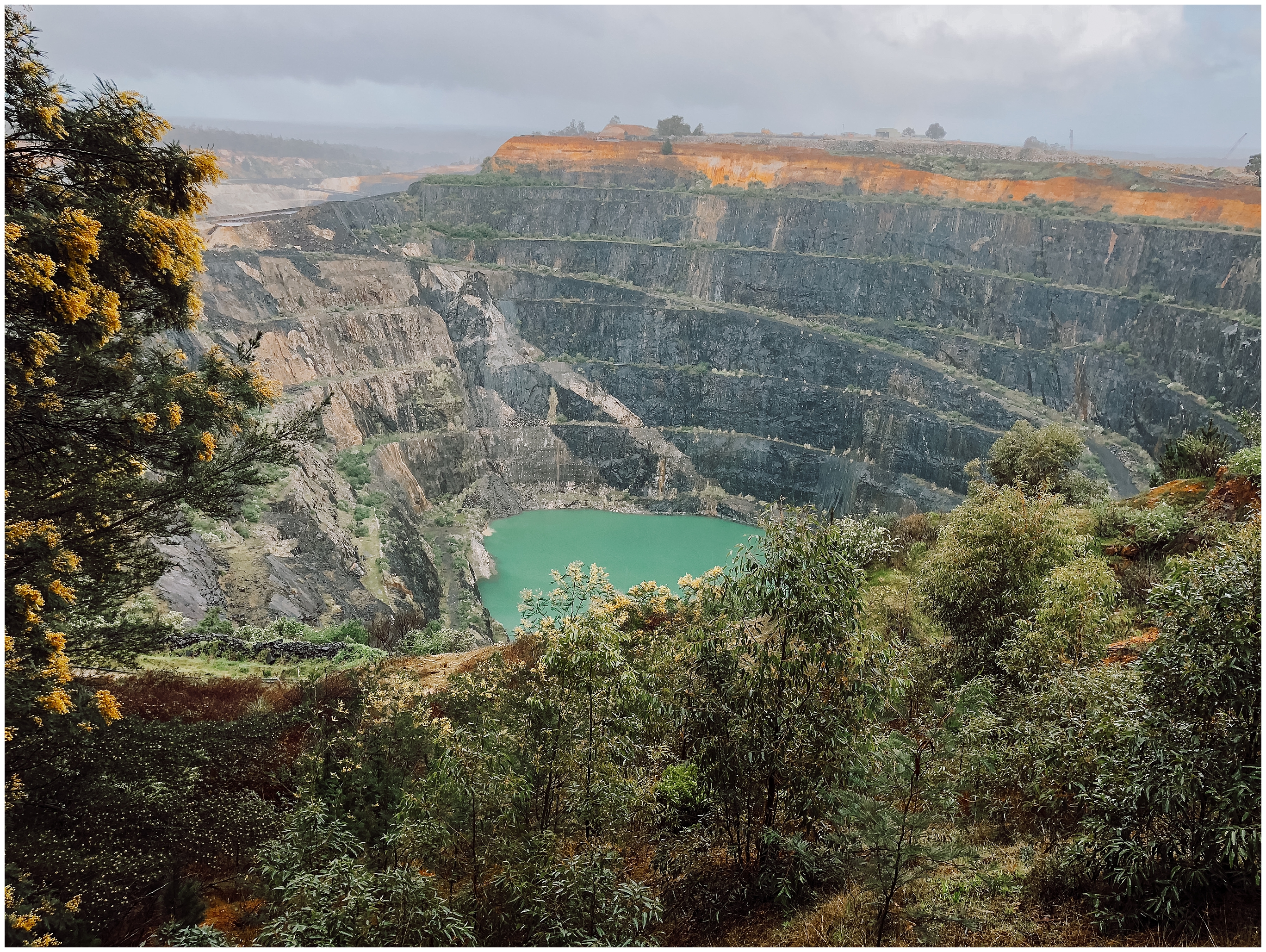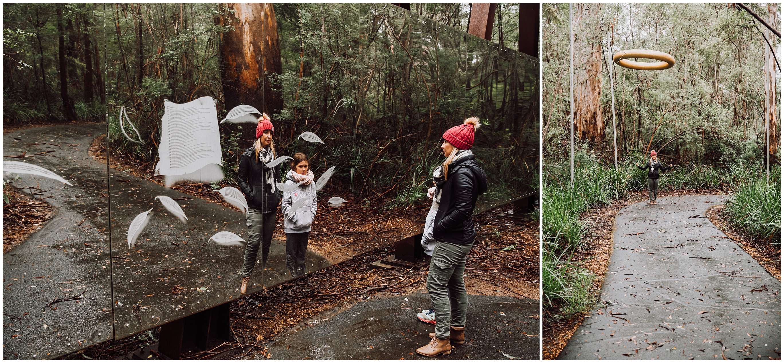 Day 77: school work morning as we listen to the hail outside the van at a chilly top of 7 degrees. Visited the giant tingle tree and circular pool, after all the rain we had overnight the pool was full of froth and definitely circling! After that we went to the Swarbrick Art Loop with a 60m wall of reflection and sculptures in the middle of the forest!